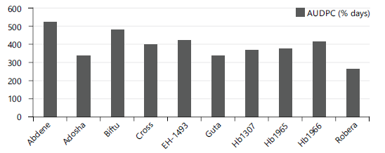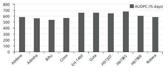 Area under diseases progress curve: The Area under diseases progress curve (AUDPC) was significantly different (p<0.05) among the food barley varieties to scald, spot and net blotch disease. The highest of AUDPC values for spot blotch (656.9% days, 655.1% days, and 677.8% days) were recorded from EH-1493, Guta and HB 1965, respectively. The lowest AUDPC of 154.9% days on Robera, 197.6% days on Biftu and 170.3% days on HB 1307 were recorded from net blotch disease. On the other hand the highest AUDPC of value of scald (518.4% days and 480.6% days) were recorded from Abdene and Biftu, respectively Fig. 1 and 2.